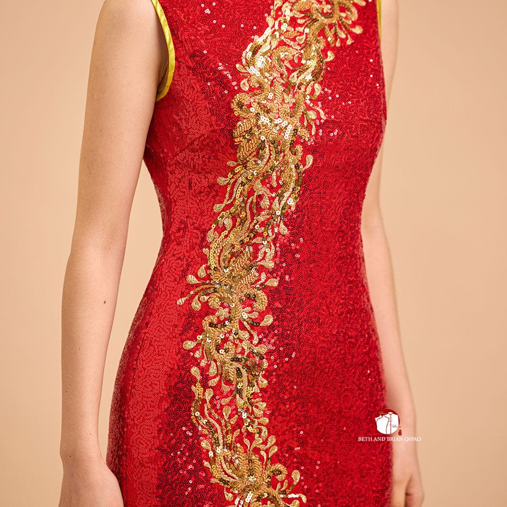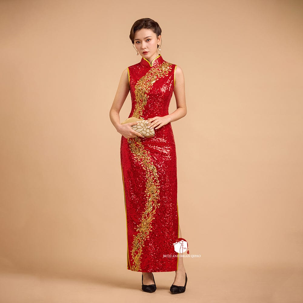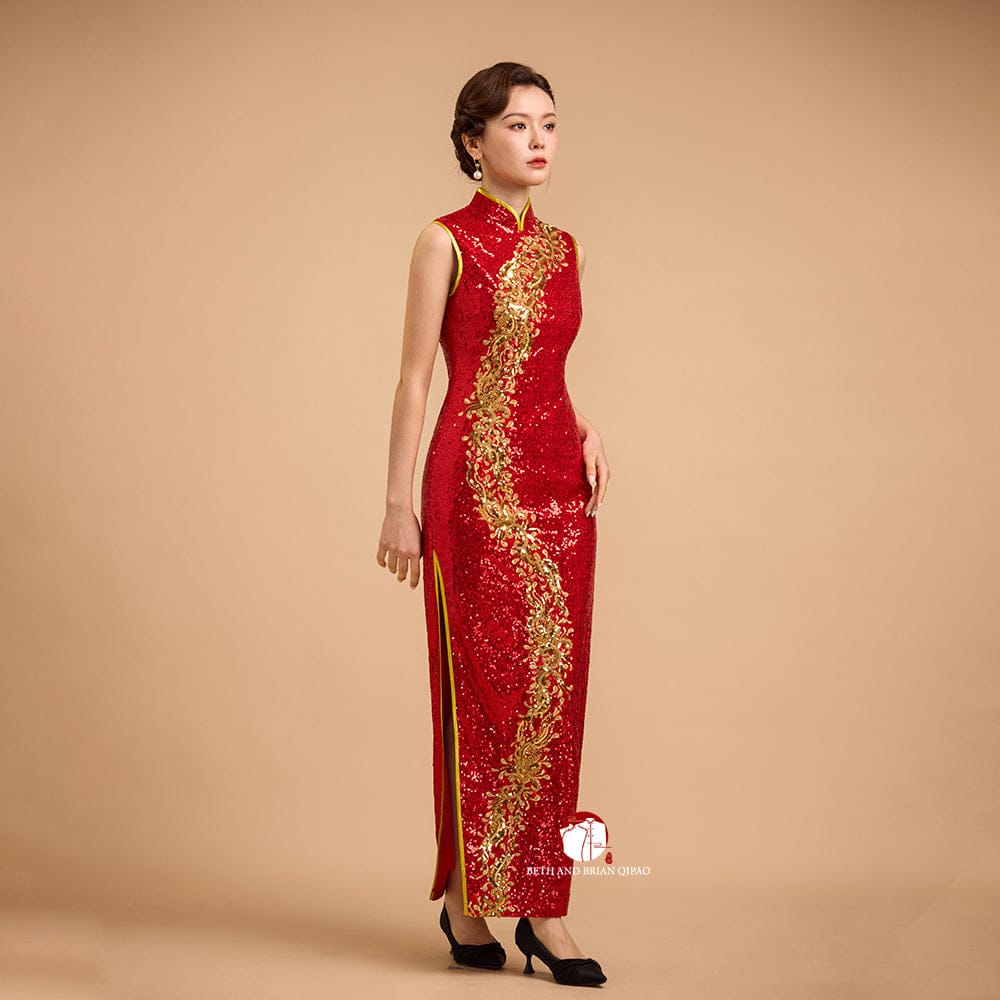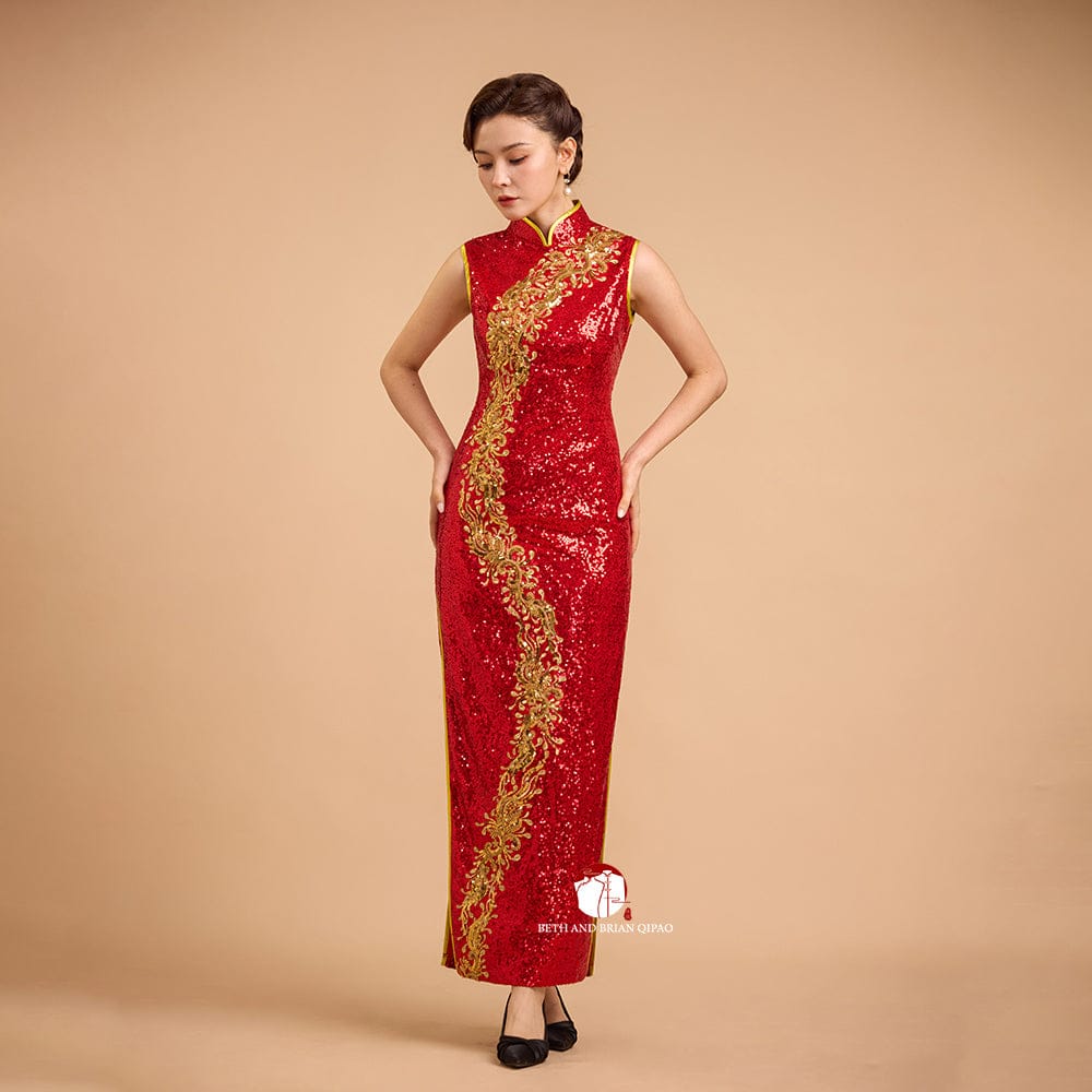 Exclusive designer collection, Floral embroidery, red sequins long Qipao
