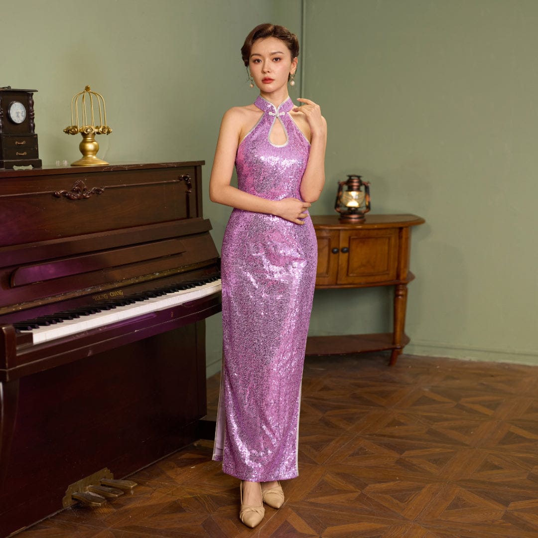 Exclusive designer collection, purple sequins long Qipao