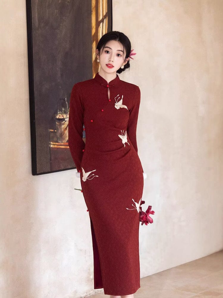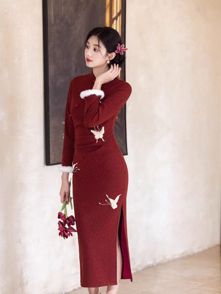 Winter collection, butterfly long Qipao with Fur-Trimmed Sleeves