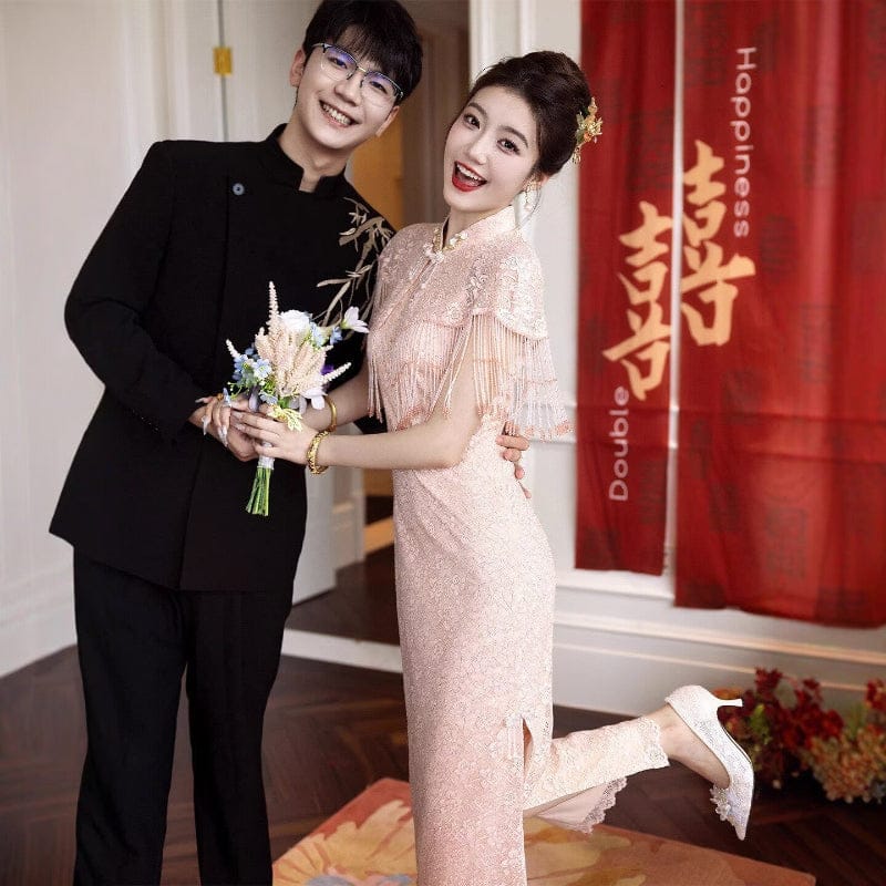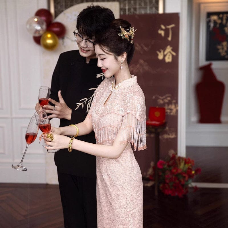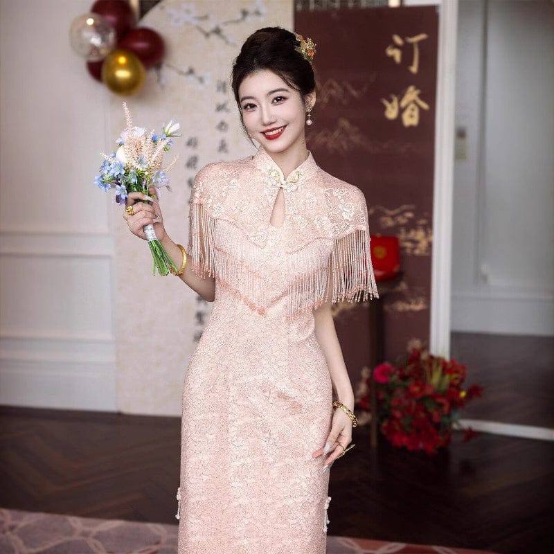 Floral pattern, pink long wedding Cheongsam with shawl set