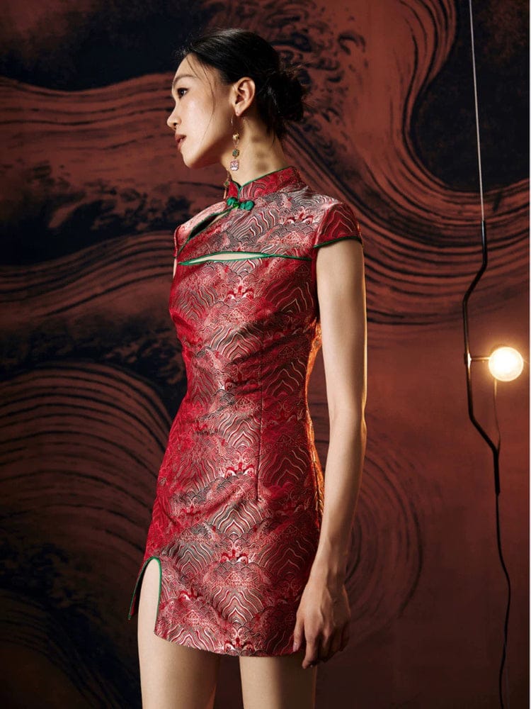 Brocade High-end Mini Qipao With Frog Buttons & Contrast Piping