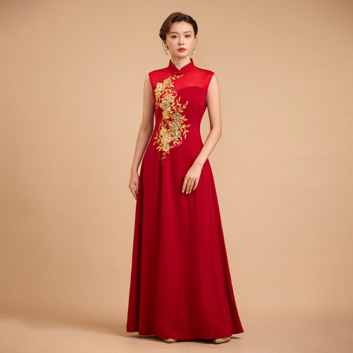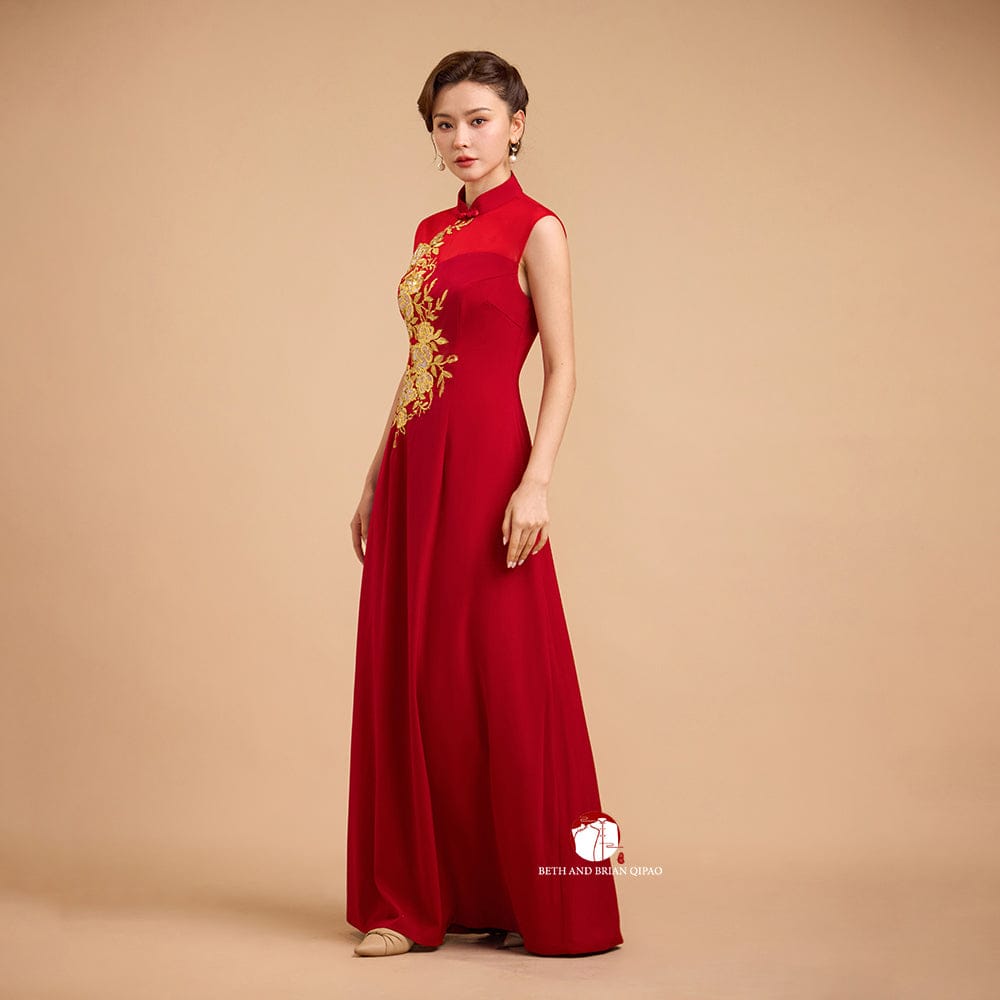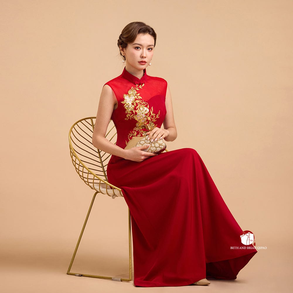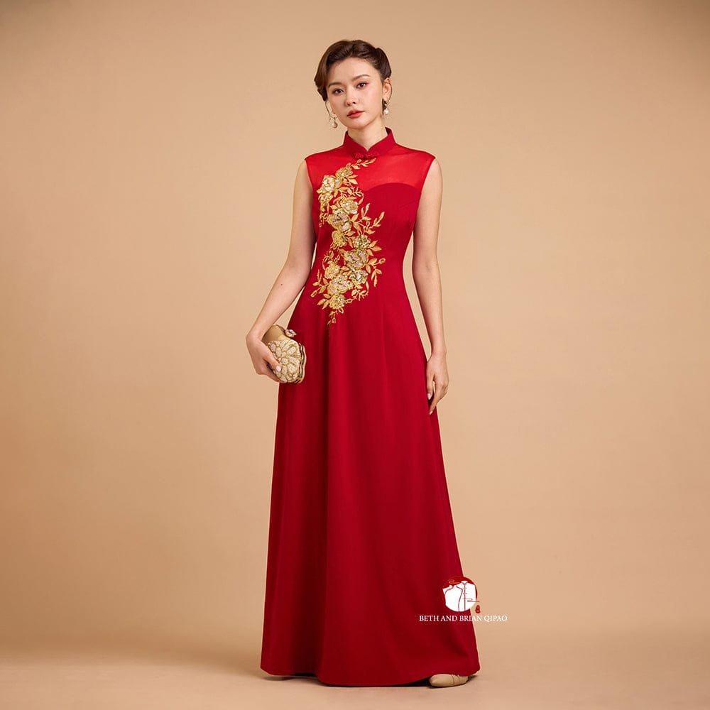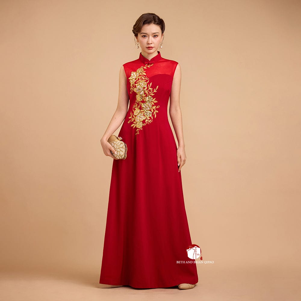 Exclusive designer collection, Floral embroidery, sleeveless A-line long Qipao
