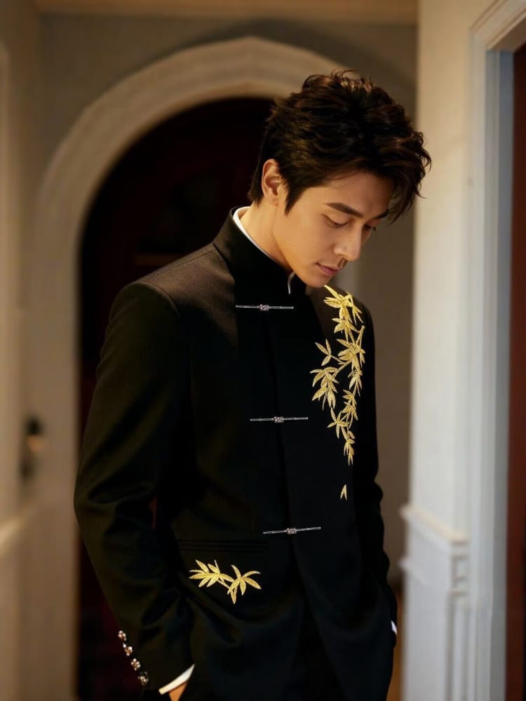 Gold bamboo leaf pattern, Men's Chinese Tang Suit Set