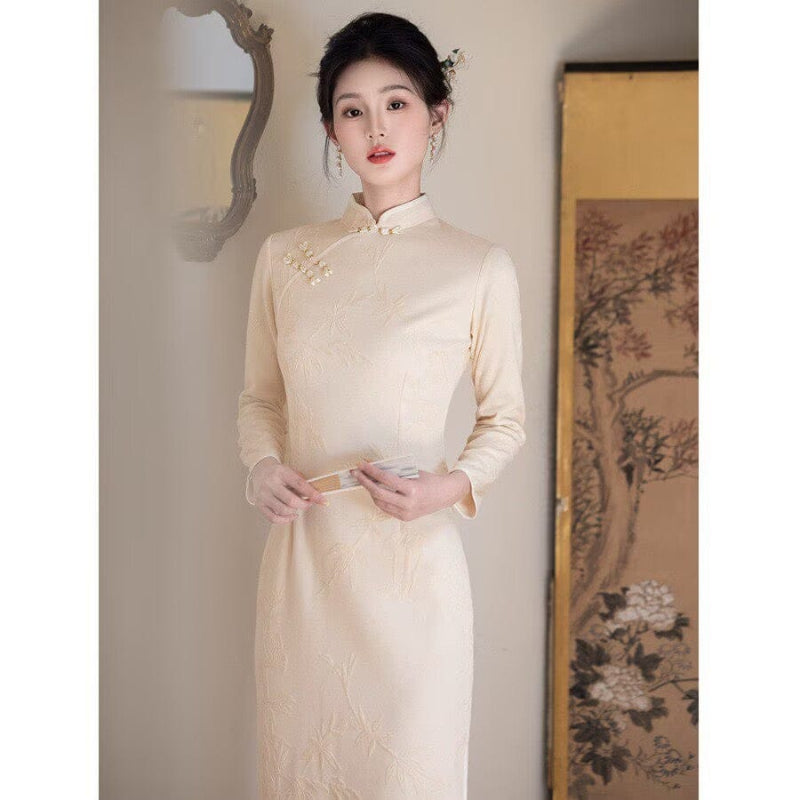 Bamboo leaf pattern, velvet red&beige midi Cheongsam