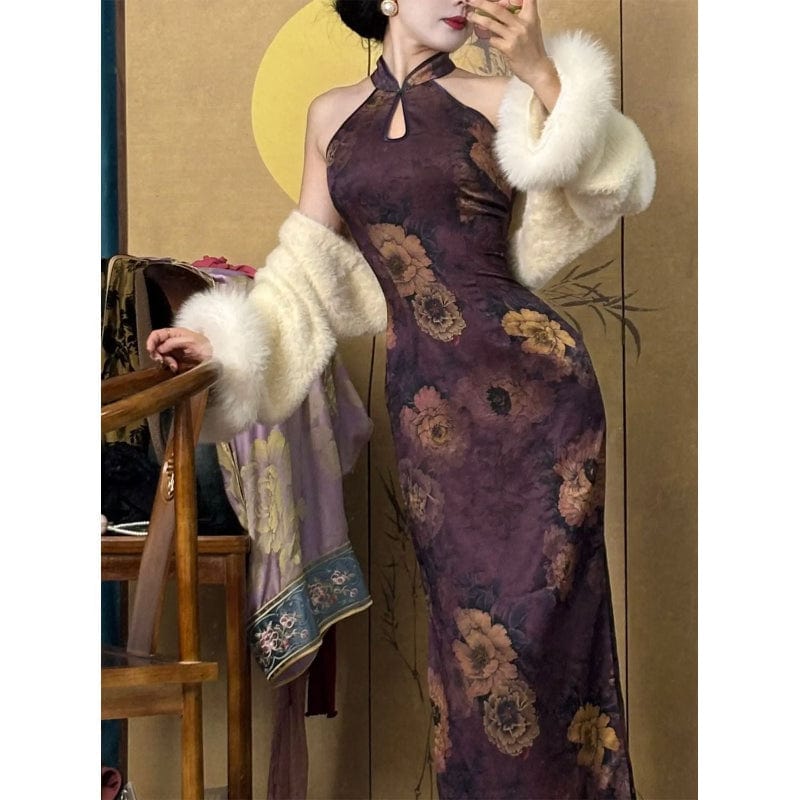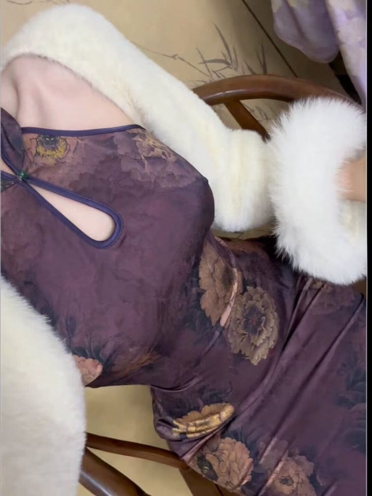 New Chinese style (新中式), floral pattern, purple midi Cheongsam