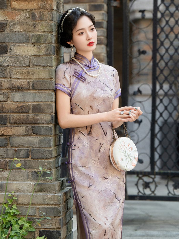 Classical Cheongsam, satin fabric, plus size, purple long Qipao