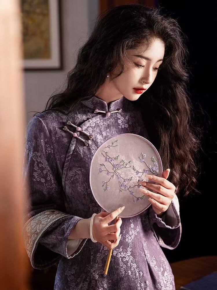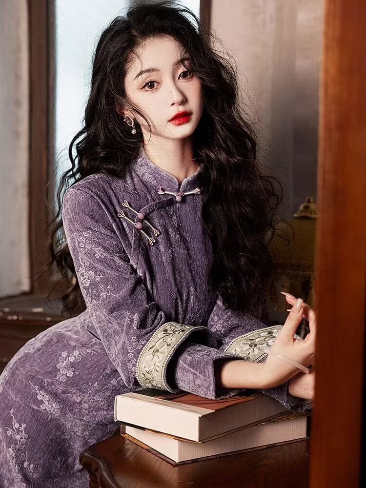 Chenille floral midi Cheongsam with long sleeves